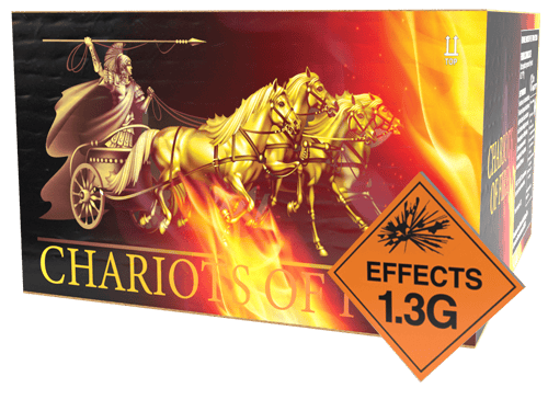 This compound offers huge powerful bursts. And a rapid rate of fire. To fill the sky with colourful stars. And kamuru tails. Furthermore this 1.3g effect barrage/cake has a 30mm bore. Therefore offering wide explosions that fill the sky. With vibrant colour stars. Of bright reds, greens and blue. hanging onto the wide-stretching tails. All things considered Chariots Of Fire with its 100 shots. Unquestionably delivers on quality and performance. As well as a resounding noise level of 10 out of 10. With a 40 second duration. Truly an outstanding category 3 firework. While containing 2.2kg of explosive content, Indeed highly recommended. Chariots Of Fire will have your spectators buzzing with excitement. Furthermore, allow a safety distance of 25 metres for your spectators. As shown in the