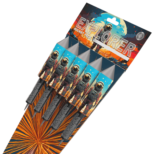 Explorer Rockets – A pack of 5 vibrant F2 rockets with stunning effects including brocade crown, white strobe, crackling flower, gold willow, and green strobe with blue stars. Perfect for safe outdoor displays with an 8-metre safety distance. Experience a dazzling moonscape-themed pyrotechnic show!
