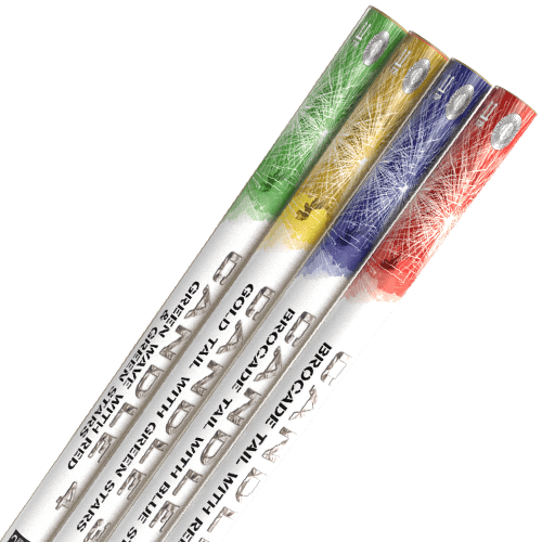 This selection offers an excellent mixed Four Candle Pack. A great value roman candle set that contains four 20mm six-shot roman candles. With each one having excellent effects. With the first firing six thick brocade tails to excellent red star peony breaks. While candle number two fires six thick brocade tails with bright blue stars. Then the third roman candle fires six gold glitter tails that rise to vibrant green stars. Finally ending with candle number four, launching green wave tail with red and green stars.