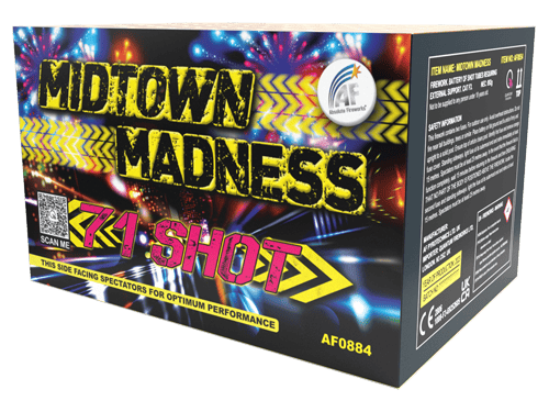 Midtown Madness is the perfect firework to light up your celebrations. Whether it's New Year's Eve, a birthday party, a wedding, or a thrilling finale for your Bonfire Night display. This extraordinary firework boasts 71 shots, each packed with a burst of excitement that will leave you breathless.