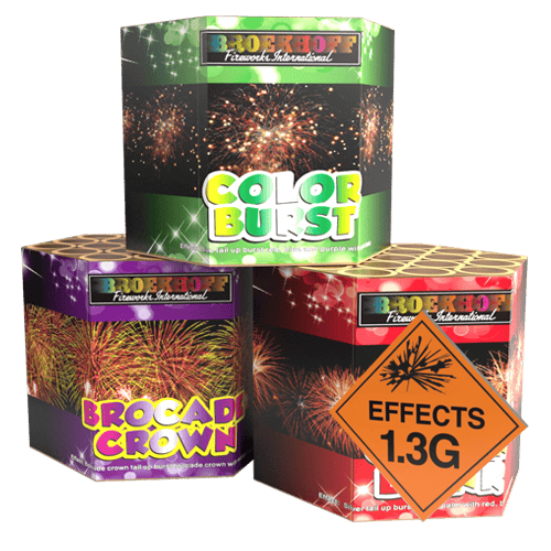 Profi box 3 Pack offers a trio smallish barrages that punch above their weight. The first Color Burst offers. Blue tail up to bursting red. And blue and purple with gold blink. The second Brocade Crown offers. Brocade crown tail up burst to brocade crown  With red and blue. The last Color Blink offers. Silver tail up burst. Silver palm, with red blue and gold blink. All three cakes having 1.3g effects. And a total of 57 shots (19 each cake). whilst last a fabulous 1 minute 15 seconds (25 seconds each). A must for your garden firework display. With each firework offering different effects. Watch as all three Profi Box cakes go through their paces. Click the play video button. To watch this barrage light up the sky. offering  114gm of Net explosive content in each barrage