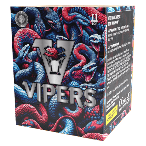 VIPERS – STRIKE FAST. BURN BRIGHT. Step aside and make way for the explosive power of Vipers, a fierce and fiery F2 category firework that strikes with 25 shots of heart-pounding energy. Designed with a 15-metre safety distance for safe yet thrilling backyard displays, this mid-sized marvel delivers a 30-second adrenaline rush packed with colour, chaos, and cobra-like intensity. From the moment it launches, Vipers commands attention. Firstly, deep-blue stars erupt into the night sky, paving the way for red strobes that crackle and dance like venomous sparks. Next, a flurry of silver chaos swimming stars spirals outward, creating a hypnotic effect that captures and holds every gaze. Then, just when you think it’s over, the finale bites back with a rapid-fire sequence that will leave your audience breathless. UNLEASH THE SERPENT Wrapped in stunning viper-themed artwork, this firework isn’t just a showstopper – it’s a statement. With every shot, Vipers proves its place among the fiercest of garden fireworks. Compact yet commanding, it delivers an unmatched combination of colour, intensity and spectacle for anyone looking to elevate their display without crossing into larger F3 or F4 territory.