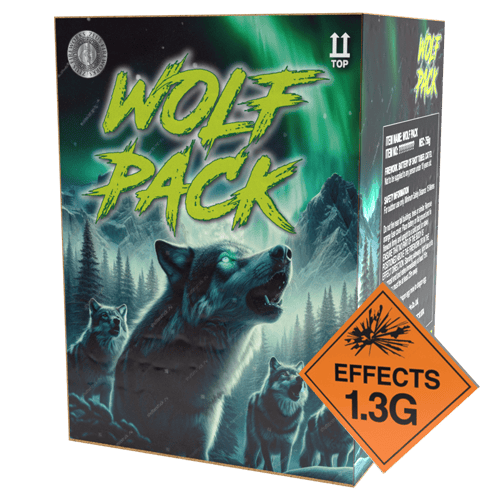 WOLF PACK — Unleash a Howling Experience Attention, firework lovers! Prepare to be captivated by the Wolf Pack, a thrilling F3 category compound firework designed to deliver an unforgettable 36-shot spectacle in just 30 seconds. This explosive powerhouse bursts with vibrant silver howling effects, followed by dazzling colour spits enhanced with crackling bees — a truly dynamic display that will command the night sky. From the first shot, the Wolf Pack howls its arrival, filling the air with electrifying energy and vivid colours that mesmerise every spectator. The perfectly timed sequence creates an engaging crescendo of effects, from shimmering silvers to lively crackling bees, making this firework a must-have for any pyrotechnic enthusiast or special event. With a safety distance of 25 meters, Wolf Pack offers a safe yet powerful performance, combining eye-catching visuals with heart-pounding sound effects. Whether you’re organising a celebration, festival, or fireworks display, this compound firework guarantees a fast-paced, intense show that will keep everyone on the edge of their seats. Experience the Wolf Pack and bring your fireworks show to life with unparalleled intensity and style. Don’t miss out on this compact but mighty firework that packs a punch well beyond its size. Explore our full range of compound fireworks to elevate your next celebration with breathtaking effects and professional-grade displays.